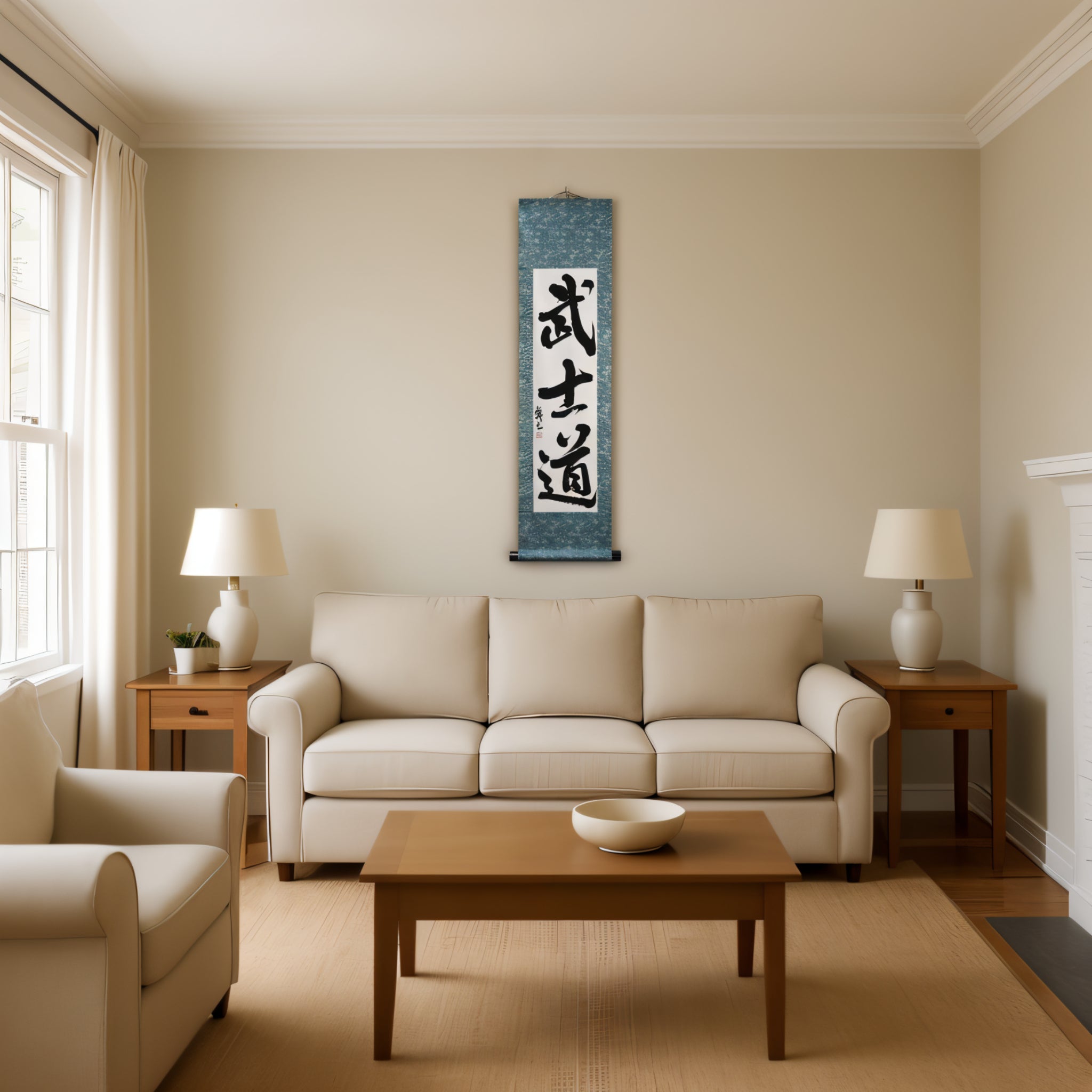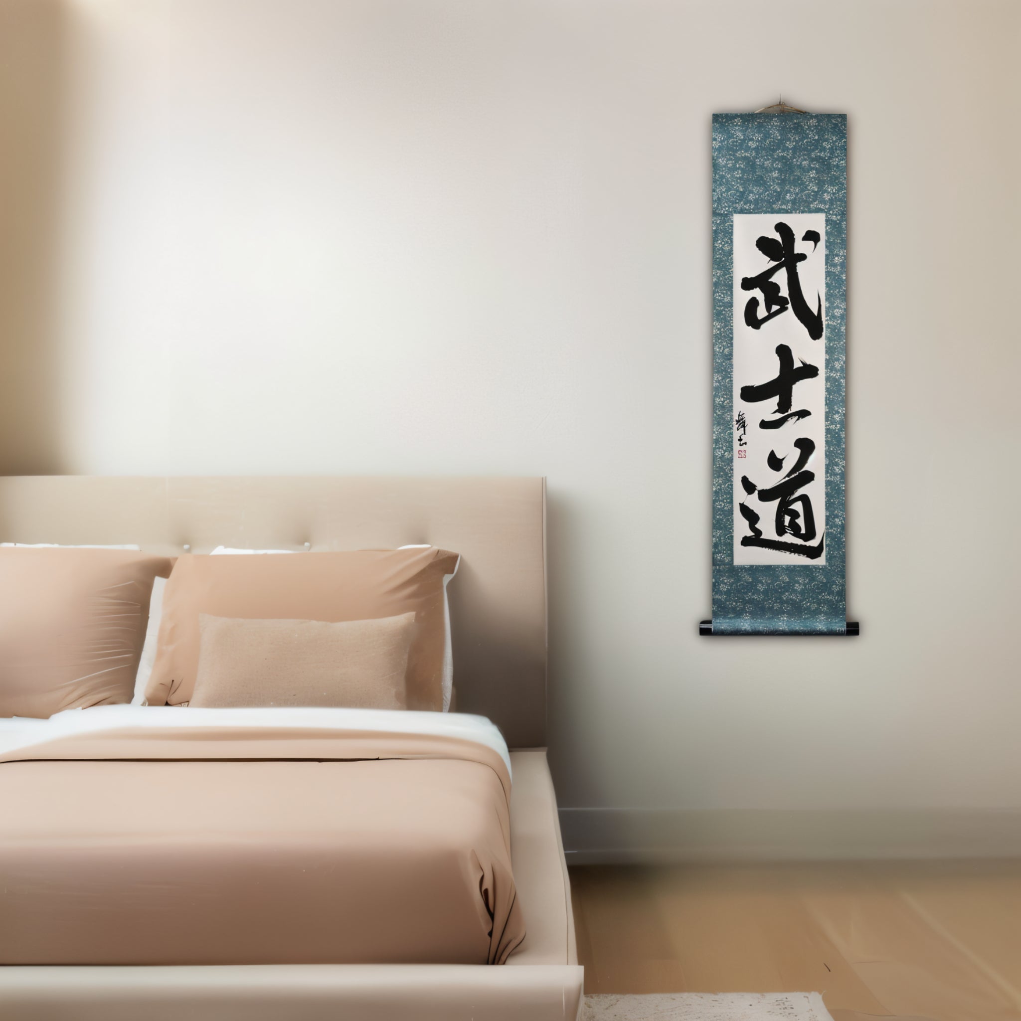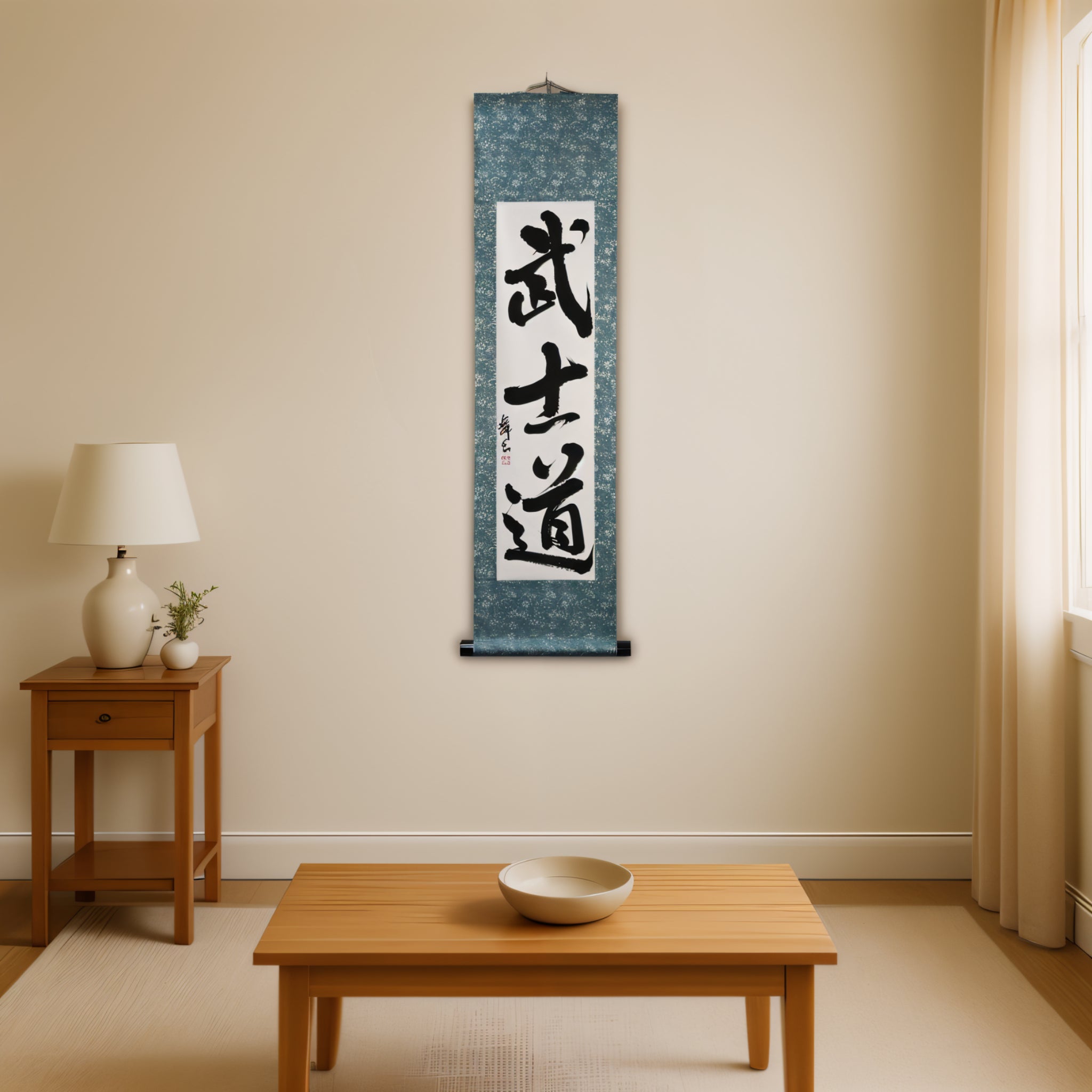 This calligraphy scroll features the powerful word 武士道 (Bushidō), which embodies the way of the Samurai.