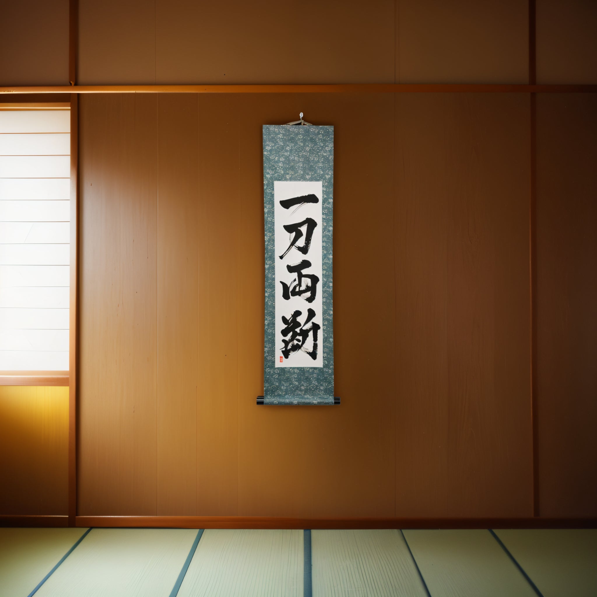 This Japanese calligraphy scroll boldly displays the phrase 一刀両断 (Ittō Ryōdan) — a powerful expression that captures the unwavering decisiveness and clarity of the samurai spirit.