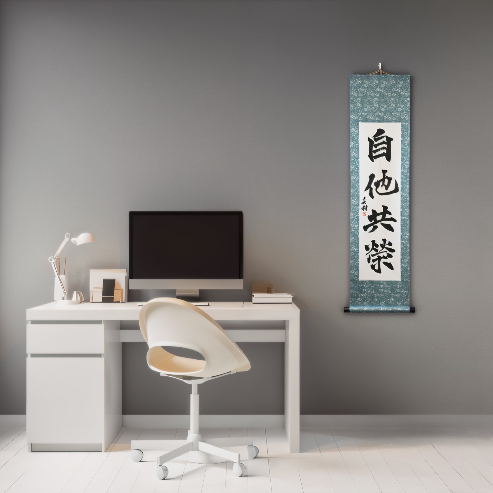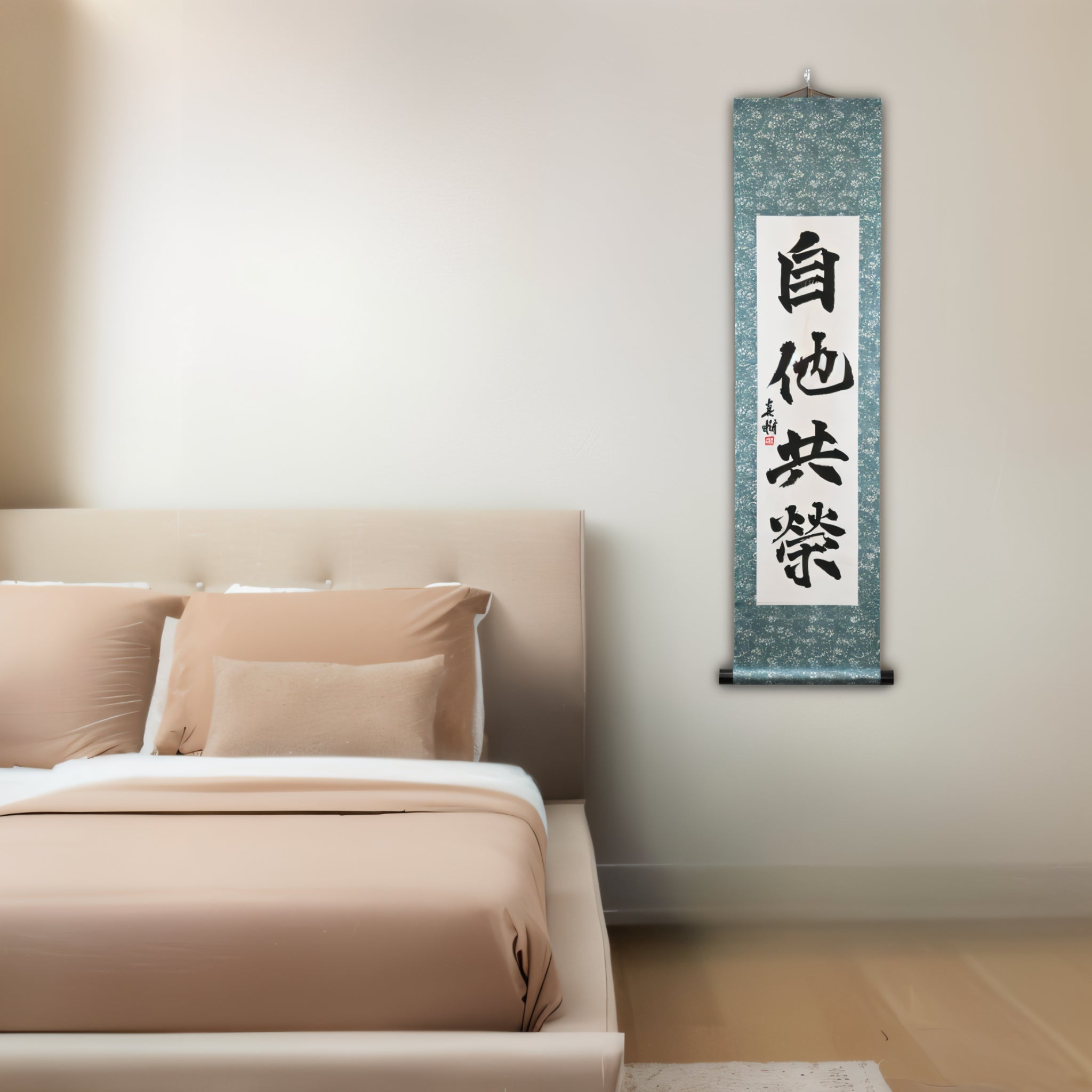 This Japanese calligraphy scroll features the timeless phrase 自他共栄 (Jita-Kyōei) — translated as "Mutual Welfare and Benefit". It is one of the two core principles of Judo, alongside 精力善用 (Seiryoku-Zenyō, "Maximum Efficient Use of Energy"), both established by Judo’s founder, Jigoro Kano (嘉納治五郎).