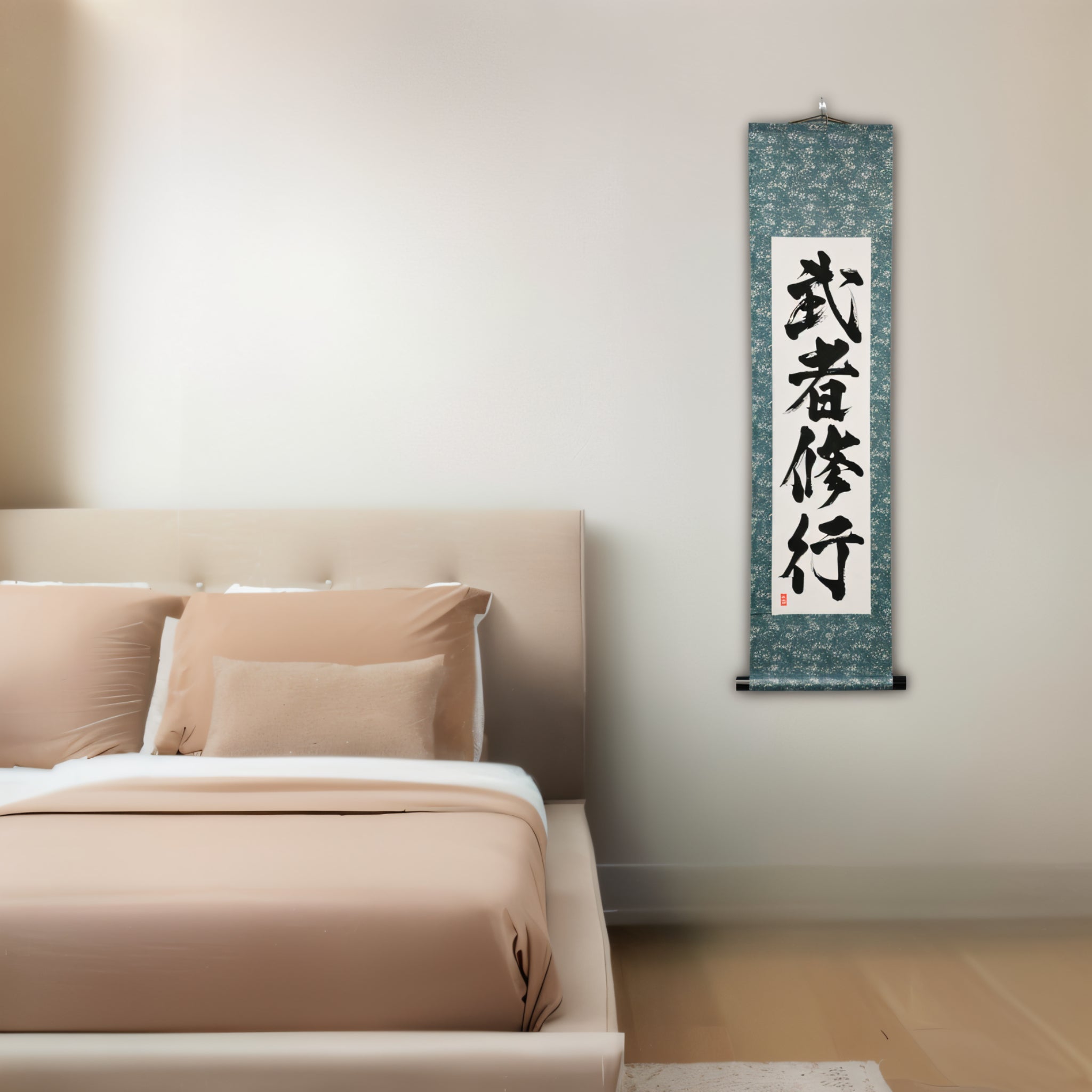 This Japanese calligraphy scroll embodies the essence of 武者修行 (Musha Shugyo) — the Samurai’s journey of self-discipline, growth, and mastery. Rooted deeply in the Samurai tradition, it represents a lifelong commitment to rigorous training and the pursuit of perfection in both skill and spirit.